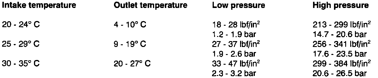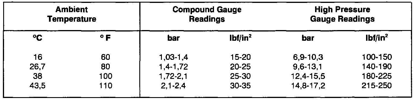 7. Read both pressure gauges and thermometers. Check readings against table below with humidity between 60% and 80%. If readings are incorrect A/C System Fault Tracing Charts