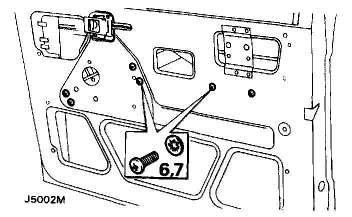 13. Remove the bolt and plain washer from the recessed hole in the front of the inner door panel under the exterior driving mirror mounting plate.