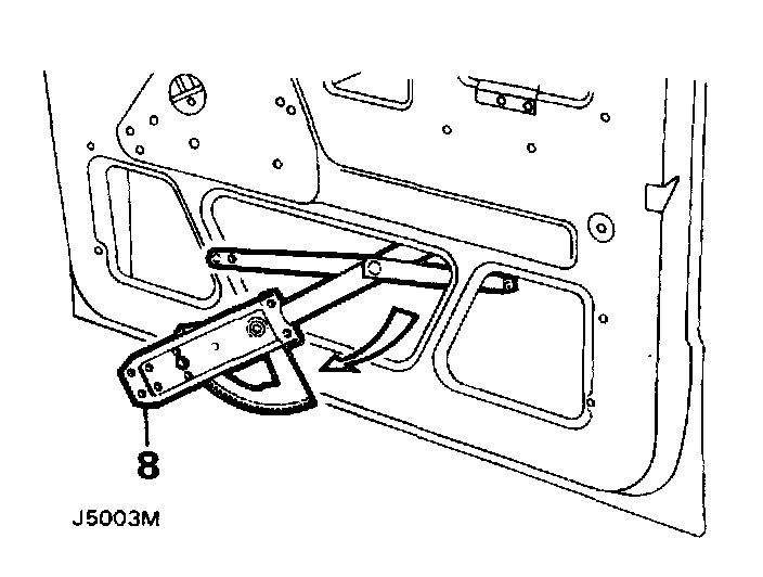 8. Disengage the lifting arm stud from the upper lifting channel, maneuver the window regulator and remove it from the lower center opening in the inner door panel.