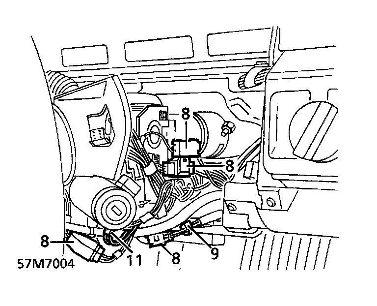 22. Connect column multiplugs. Secure ignition lock illumination bulb in holder, position bulb harness in clip.