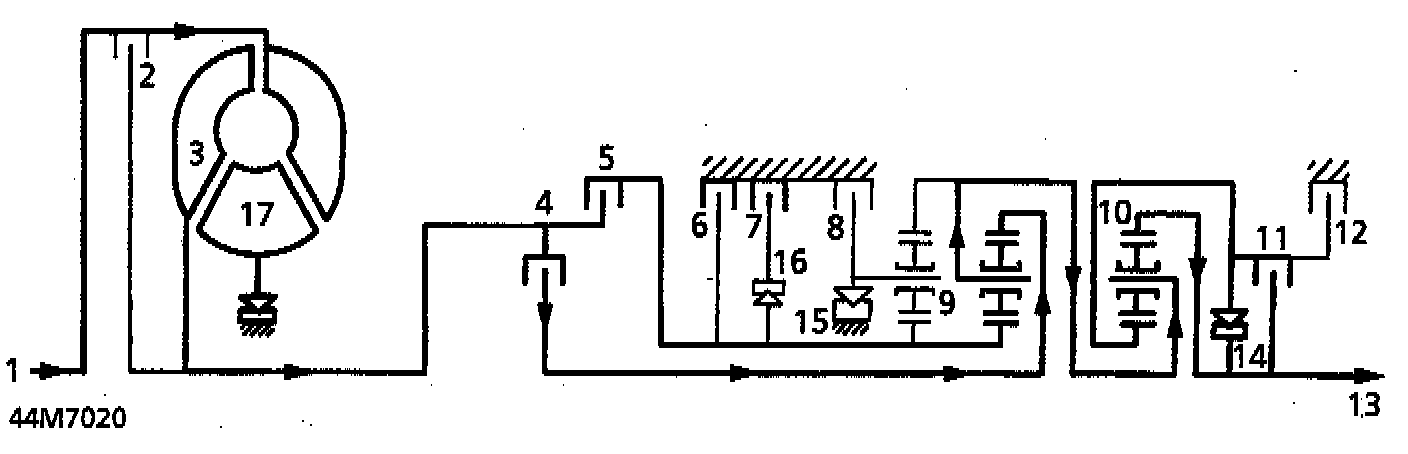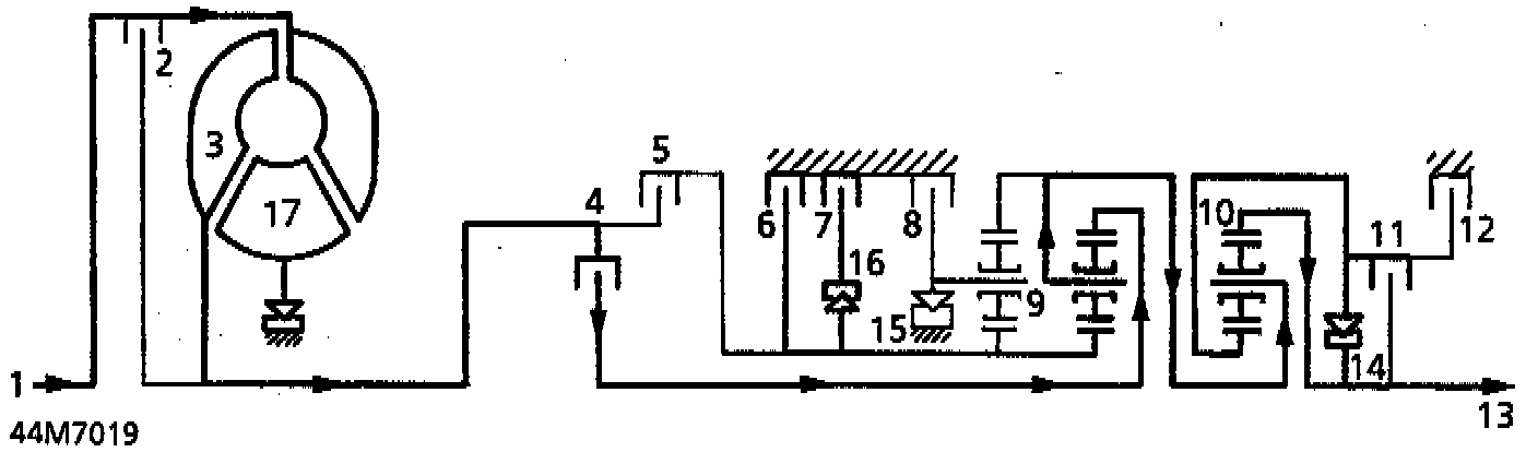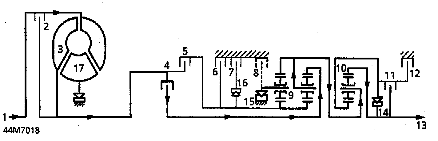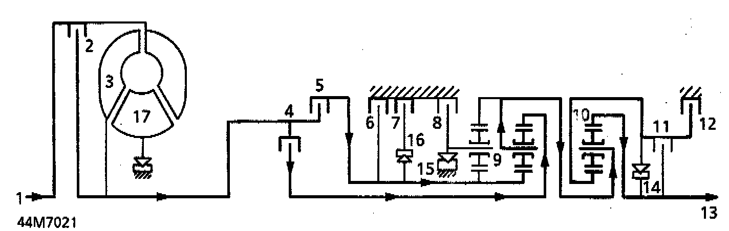 Clutches (4), (6), (7) and (11) are engaged. Freewheel (15) overruns. The hollow shaft with the sun wheel of epicyclic gear set (9) is locked, see 44M7019 Epicyclic gear set (10) also rotates as a solid unit.