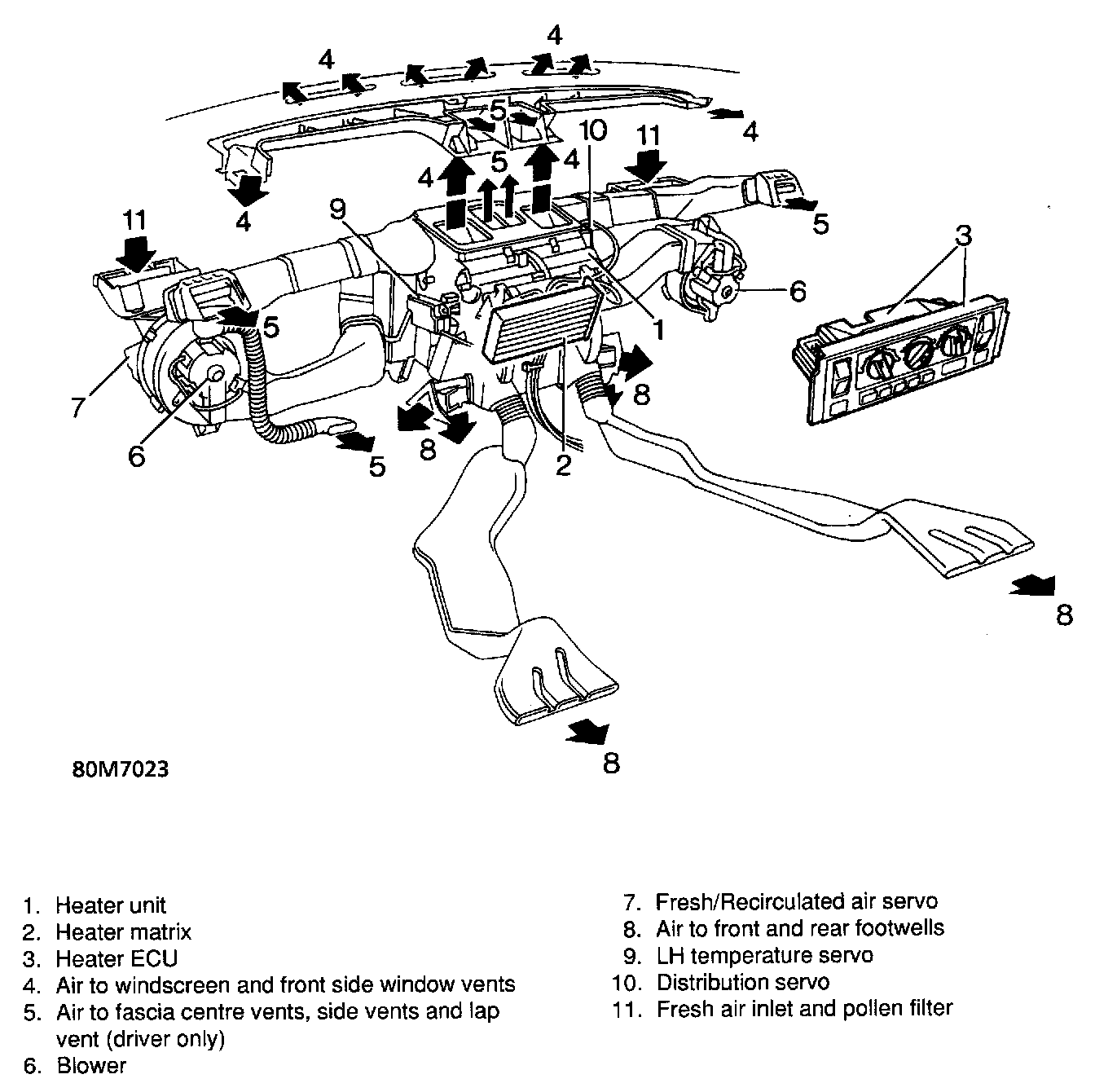 The heater unit consists of a housing containing a heater matrix which is connected to the engine cooling system. As water is circulated continuously through the heater matrix, the selection of hot or cold air is controlled by servo operated LH and RH blend flaps directing the air through or around the heater matrix. The LH and RH blend flaps operate independently to allow different temperatures to be set for the LH and RH air vents. The servo operated distribution flaps control the flow of air from the heater unit to the outlet vents. Air distribution is common to both sides of the vehicle interior.