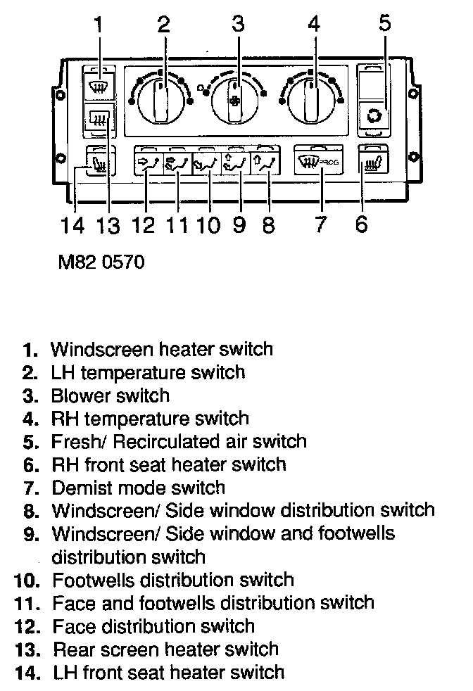 The Heater ECU comprises an integrated ECU and control panel, and is mounted in the centre console below the in-car entertainment unit. To control the heating and ventilation system, the ECU outputs signals to the flap servos and blowers in response to selections made on the rotary switches and momentary push switches installed on the control panel. In addition to the heating and ventilation system, the Heater ECU also controls the rear screen heater and, where fitted, the windscreen heaters and' the seat heaters. Each push switch on the control panel has a LED to indicate the selections made.