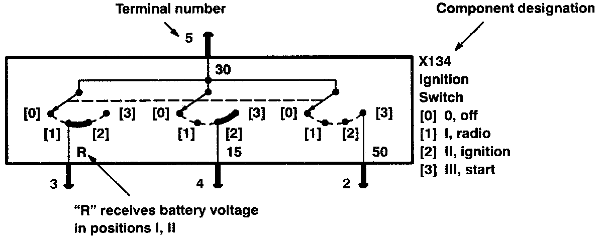 x Switched battery voltage through the ignition load relay or accessory relay; ignition switch is in position I or II.