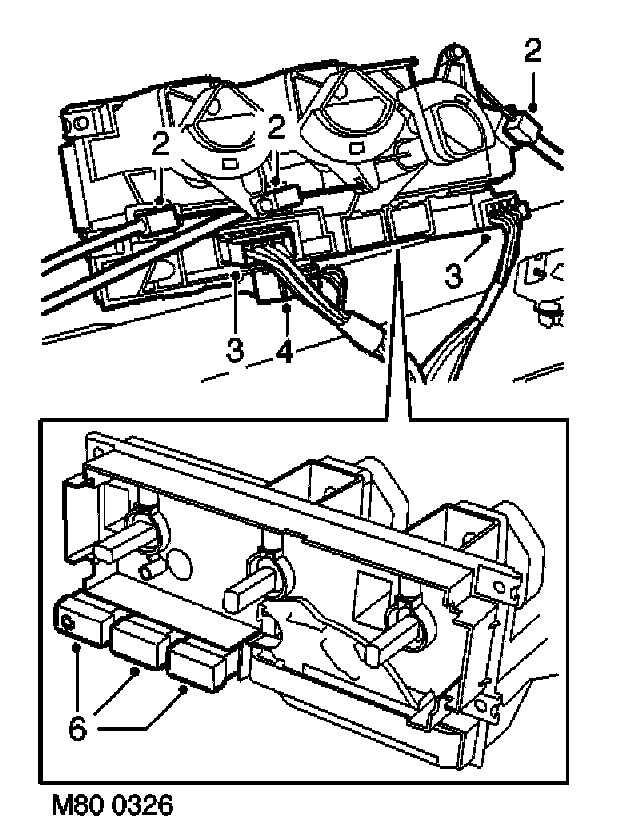 2. Release temperature and air distribution cable abutments from heater control housing and disconnect inner cables from controls.