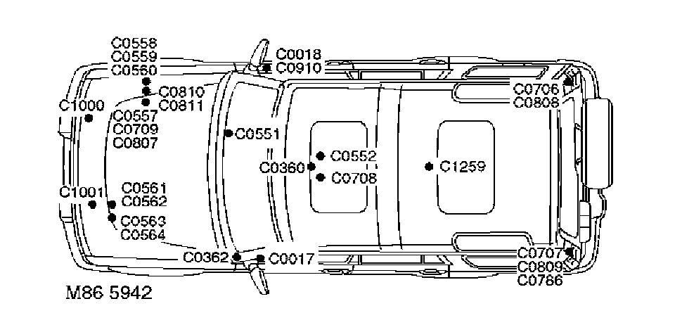 The following illustration indicates the general position of each earth point and earth header on the vehicle.