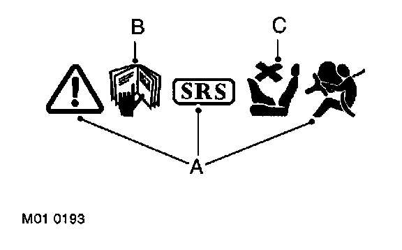 Warning symbols are displayed at various positions in the vehicle (either in a suitable prominent position such as driver and passenger side glass, or attached to the component itself) to indicate SRS items which must be treated with particular care. Exact positions of SRS warning labels may vary dependent on legislation and market trends.