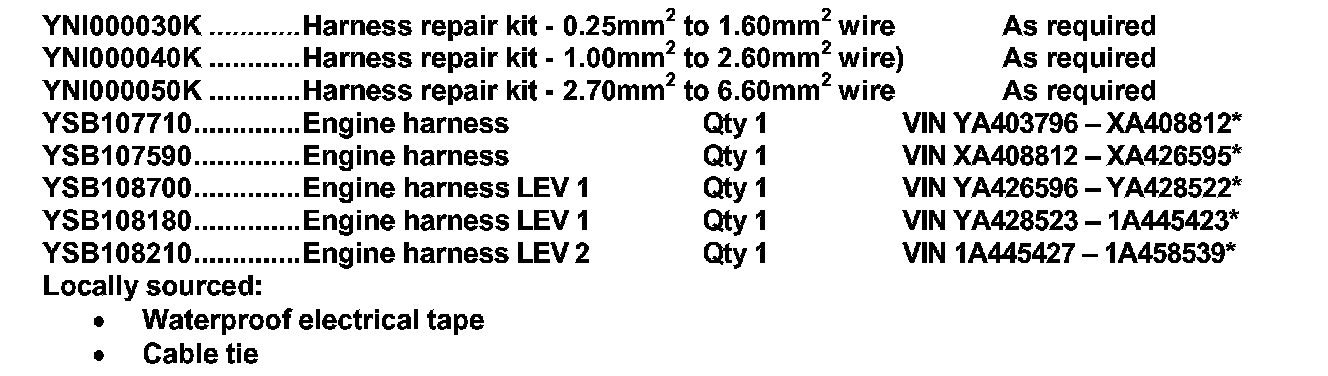 2. * VIN ranges are approximate. A label with part number is fitted to the harness adjacent to the battery box. Prior to ordering a replacement harness the harness part number on the vehicle must be checked to ensure that the correct harness is ordered.