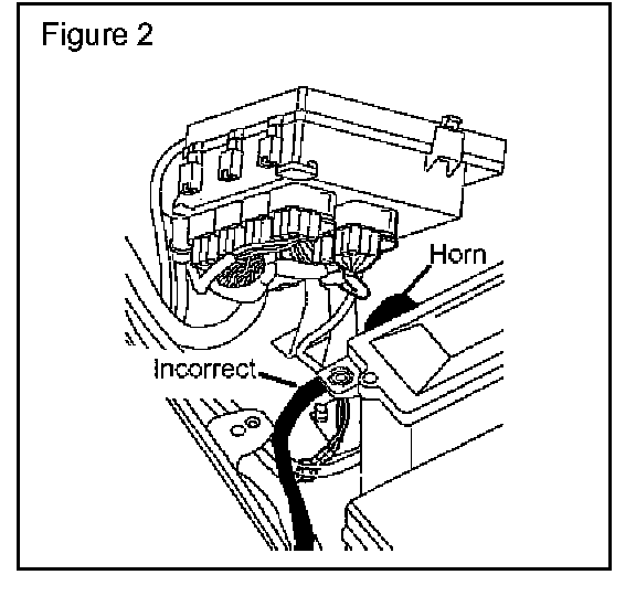 6. Determine if the harness lead is incorrectly routed between the alarm horn and fuse box bracket. (Figure 2)