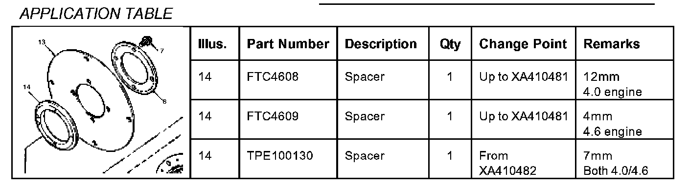 To ensure that the correct spacer is fitted to a vehicle under repair, refer to the application table and to the Parts Information section for the correct thickness notations for each application.