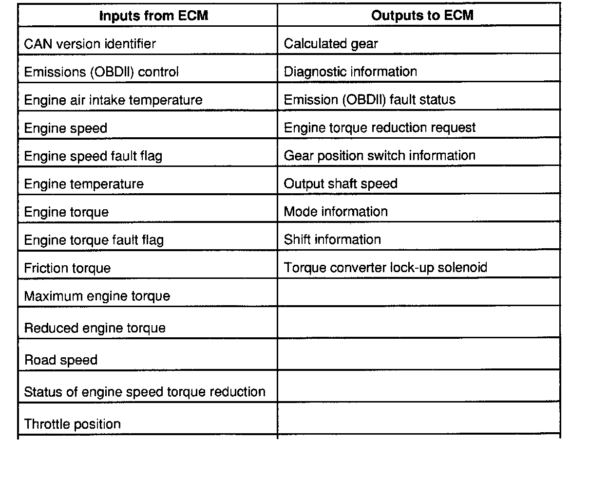 The additional engine data is used by the EAT ECU to give improved transmission quality and allows the EAT ECU to operate in a greater number of default modes in the event of sensor failure. Inputs and outputs on the CAN communication bus are listed in the table that follows.