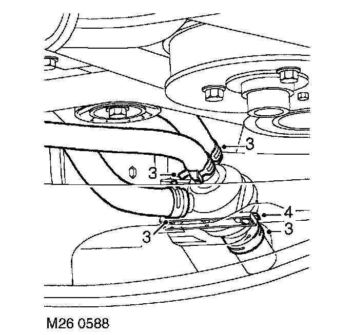 3. Release 3 clips and disconnect coolant hoses from thermostat.
