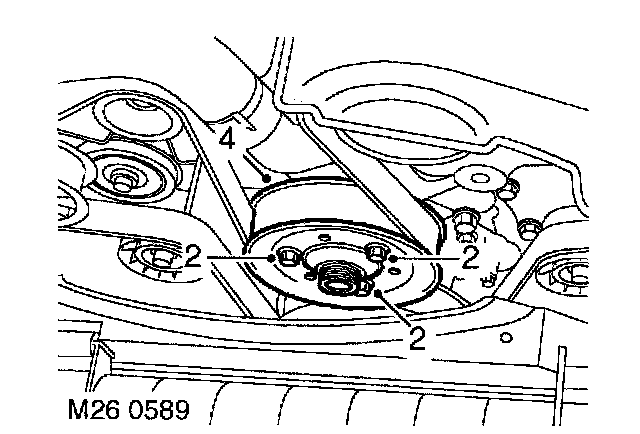 2. Loosen 3 bolts securing water pump pulley to water pump.