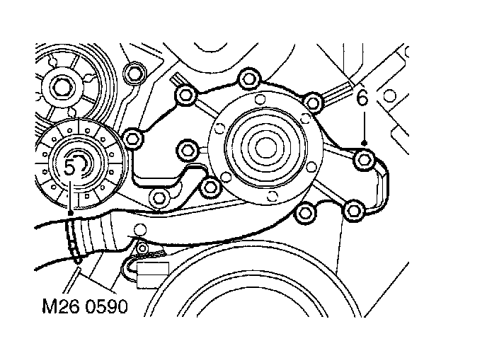 10. Ensure mating faces of water pump pulley and flange are clean, fit pulley and tighten bolts to 22 Nm (17 ft. lbs.).