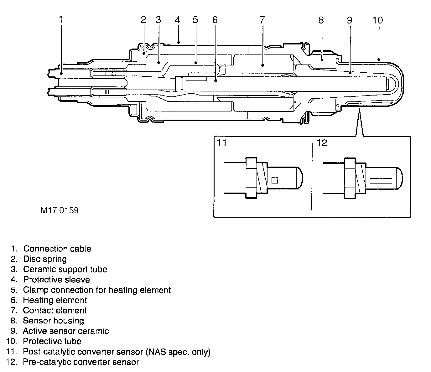The sensor is protected by an outer tube with a restricted flow opening to prevent the sensor's ceramic from being cooled by low temperature gases at start up. The pre-catalytic sensors are identified by three slots in the protective tube, whereas the post-catalytic sensors have four square indentations and a hole in the end of the protective tube (NAS only).