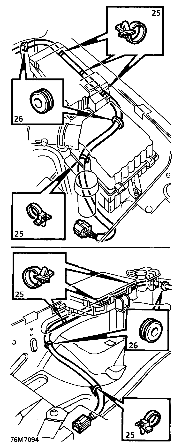 24. Raise air cleaner and battery tray to gain access to crash sensor harness clips.