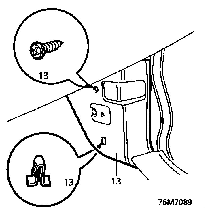 13. Remove screw securing each A post lower trim panel. Release panels from sprag clips. Remove both trim panels.
