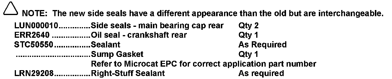 Where a complaint of an oil leak from the above listed area is confirmed, replace the rear main bearing cap side seals with the new rear main bearing cap side seals now used in production. As part of the replacement of the side seals the crankshaft rear oil seal should also be replaced and the rear cam galley and bore plugs inspected for seepage.