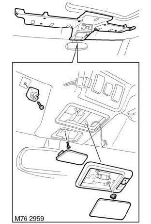 4. Remove 2 nuts securing front interior lamp to headlining.