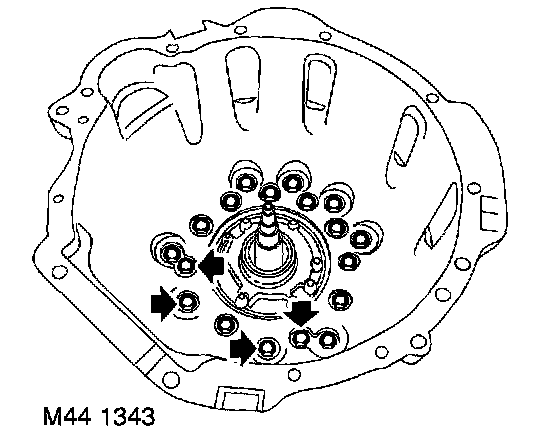 2. Remove 18 bolts and plain washers securing torque converter and intermediate plate to gearbox casing. Note the position of the 4 bolts that have sealant applied to the bolt threads and 6 bolts, (outer ring), which are shorter.