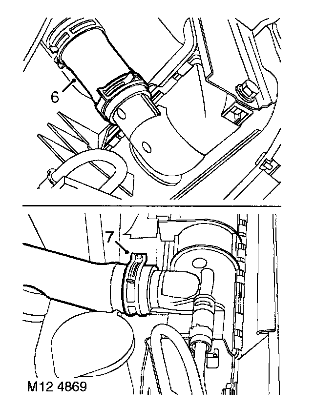 6. Release clip and disconnect bottom hose from radiator.