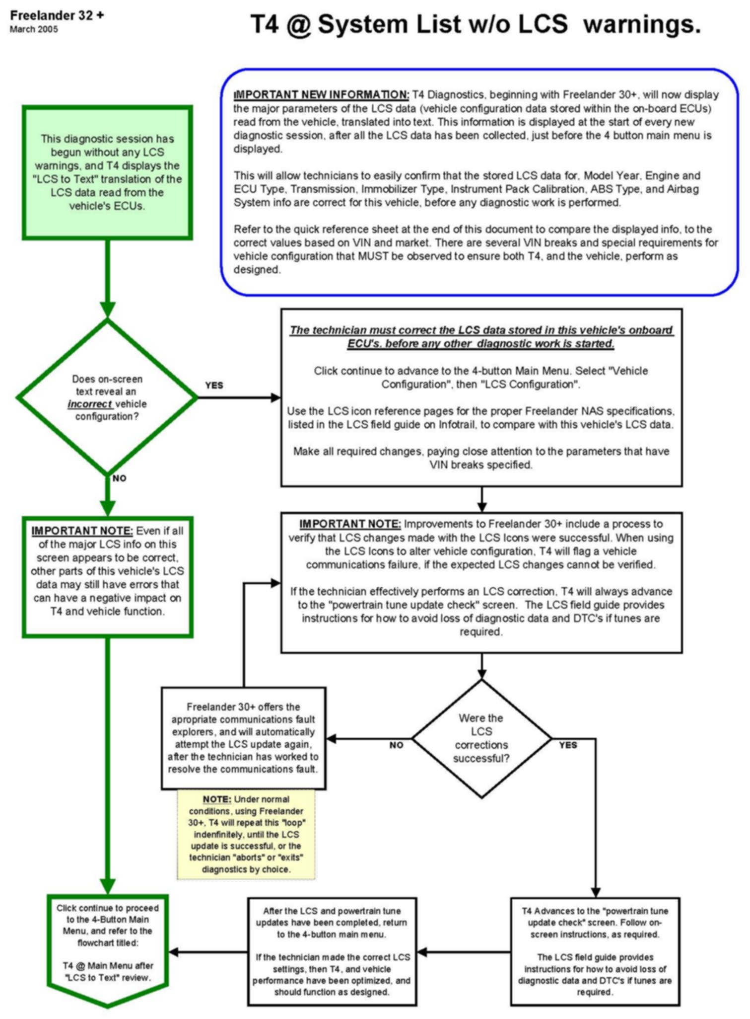 These flowcharts should be used when troubleshooting and/or giving technicians assistance when using "Freelander 32+" in T4. Locate the proper flowchart based on T4 behavior at the start of the current diagnostic session. See flowchart titles to match with T4 behavior.