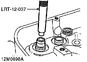1. Using valve guide remover, LRT-12-037 press valve guide out into combustion face side of cylinder head.