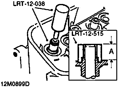 4. Fit LRT-12-515 over valve guide and continue to press guide into cylinder head until tool LRT-12-038 contacts tool LRT-12-515; remove tool.