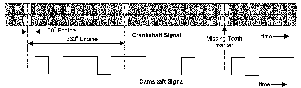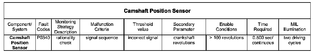 The cam gear wheel has four slots machined in it enabling cylinder identification every 90°. The signal is used for cylinder recognition; enabling sequential fuel injection, knock control and cylinder identification for diagnostic purposes. The system checks the camshaft position sensor signal at every software reference mark i.e., 54° before top dead centre (2 teeth after the reluctor 2nd missing tooth). A fault condition is recognized if the signal does not change state (high to low or low to high voltage) every crankshaft revolution.