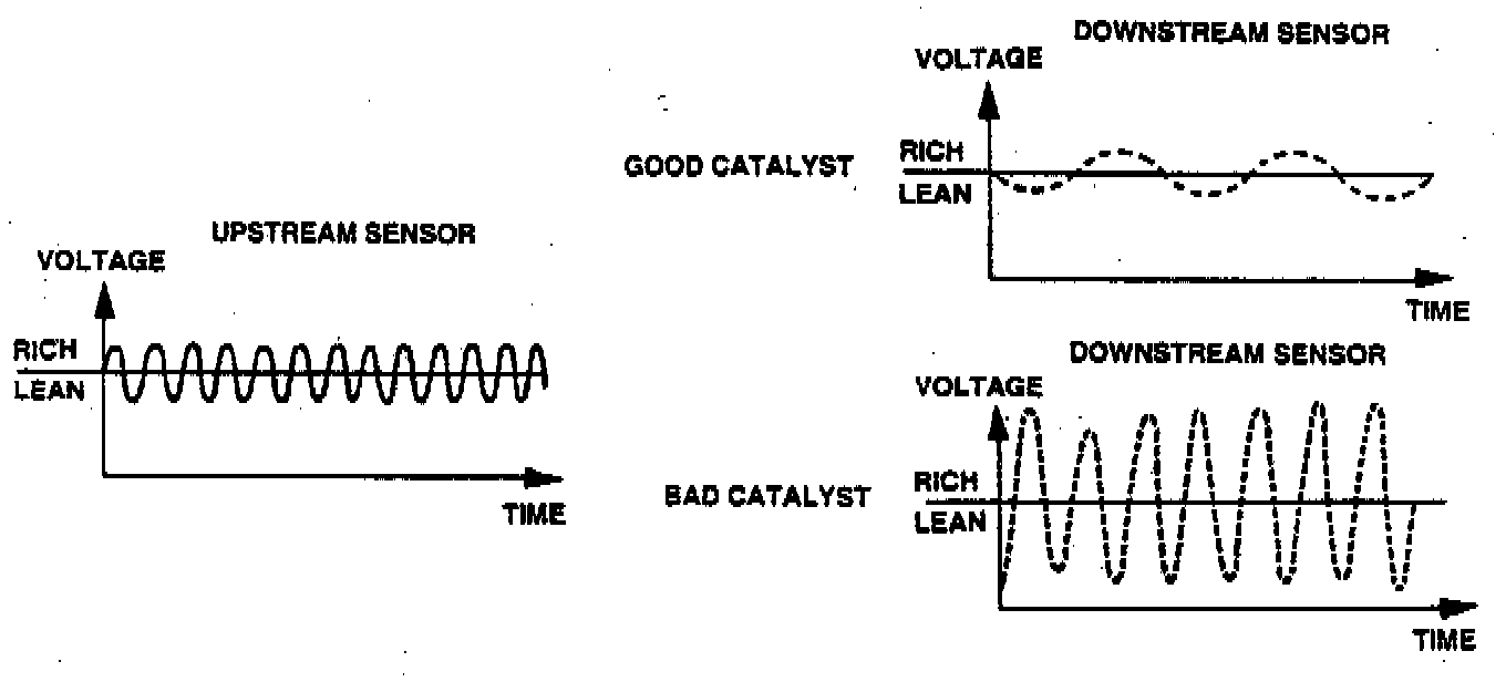 The Three-Way Catalyst (TWC) or Catalytic Converter, is a central device in the vehicle's emissions control system. Over time, deterioration of a catalyst's operating efficiency can lead to an increase in hydrocarbon emissions. OBD II requires that the ECM monitor operation of the vehicle's TWCs to ensure that they are operating within specification. This is accomplished by monitoring signals produced by oxygen sensors mounted ahead of (upstream) and below (downstream) of each TWC.