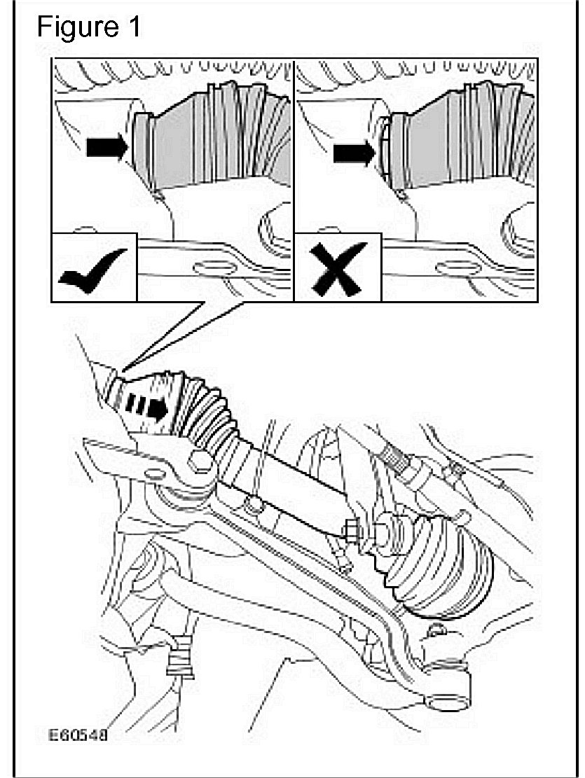 ^ Verify that there is no visible gap between the front driveshaft inboard joint and the differential housing on the left-hand side. (Insert "check mark" in Figure 1)
