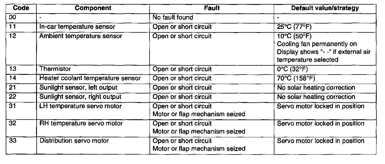 A manual diagnostic check includes a check of the sunlight sensor, and is initiated by pressing and holding the AUTO switch and the air distribution switch, then turning the ignition switch from off to on. The audible warning sounds once and the indications on the control panel display illuminate. FC is shown in the LH temperature window and the results of the check are shown as a two digit fault code in the RH temperature window. If a fault is detected, the audible warning sounds three times and the AUTO window on the display flashes on and off for 20 seconds. If more than one fault is detected, the fault codes cycle in numerical order, at 1 Hz. The audible warning sounds as each fault code is shown. In low light conditions, to avoid false sunlight sensor fault indications, the sunlight sensor should be illuminated with a strong light source.