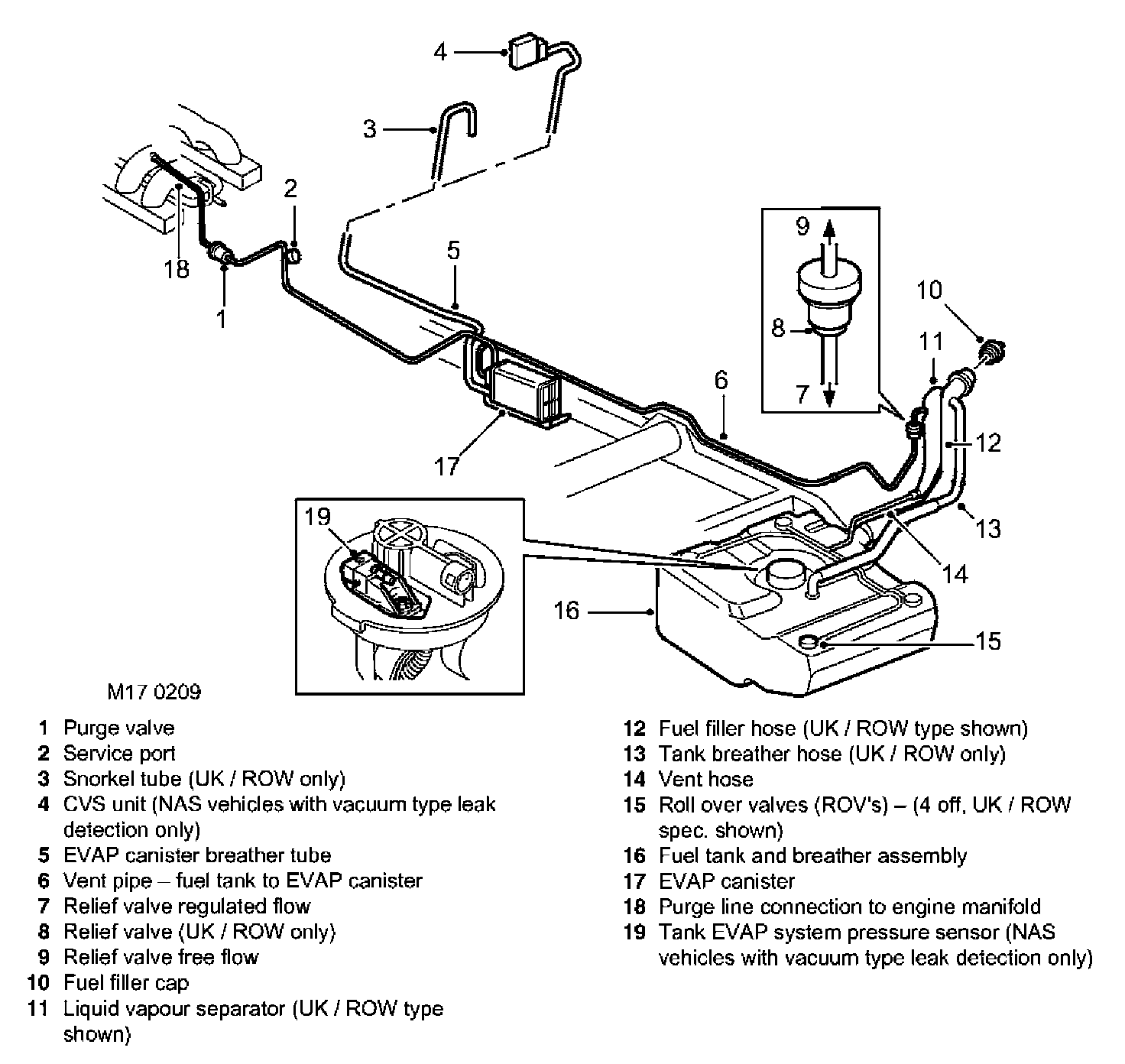 NAS vehicles have stainless steel filler necks whilst all other markets use moulded plastic filler necks. On NAS fillers, a valve closes the roll-over valve (ROV) vent line when the fuel filler cap is removed; for all other markets a pressure relief valve is fitted into the ROV vent line.