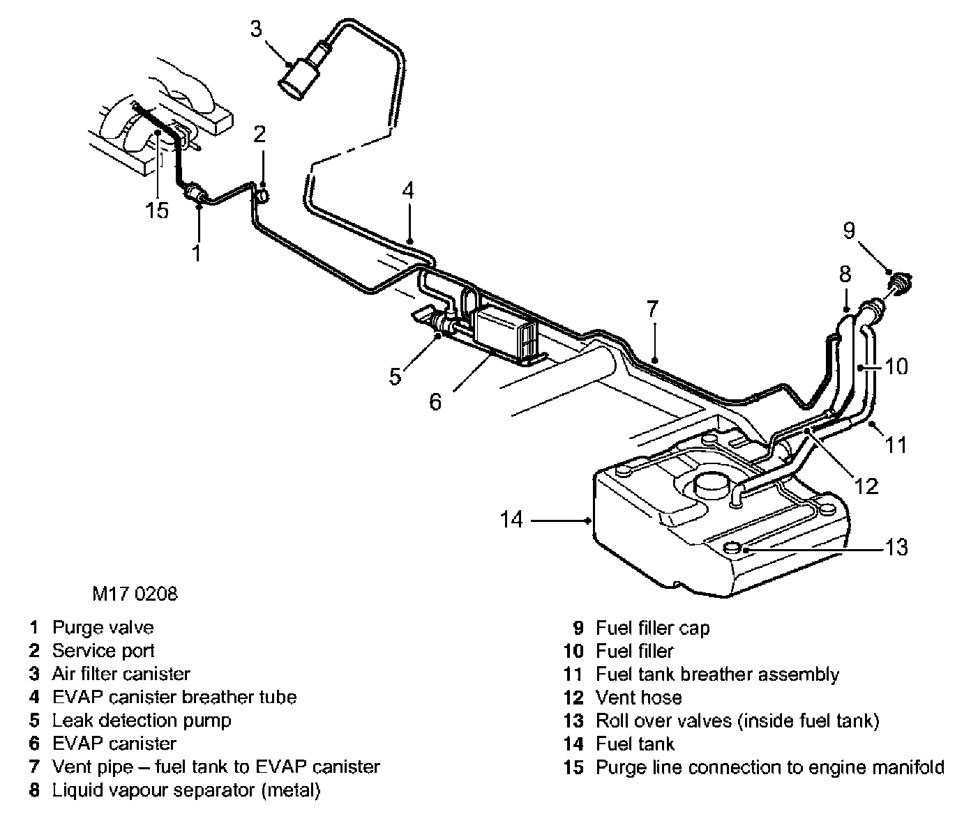 A fuel vapor separator is fitted next to the fuel filler neck, the construction is different between NAS and ROW vehicles; the liquid vapor separator (LVS) on NAS vehicles is an L-shaped metal tube and for all other markets it is an integral part of the moulded plastic filler neck.