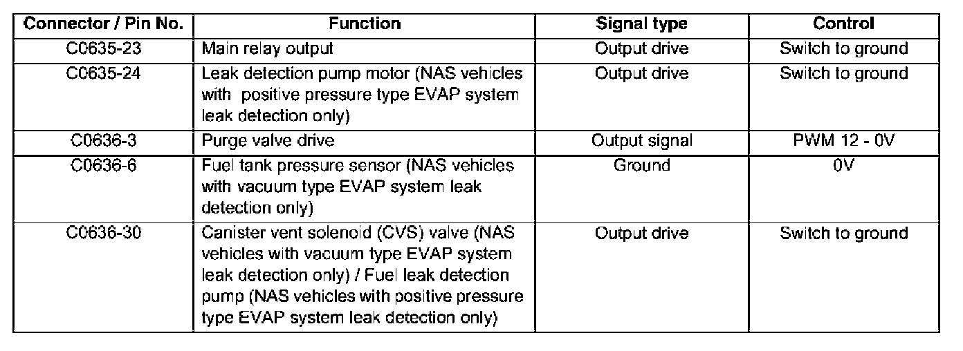 The ECM connectors and pins which are pertinent to evaporative emission control are listed in the following table: