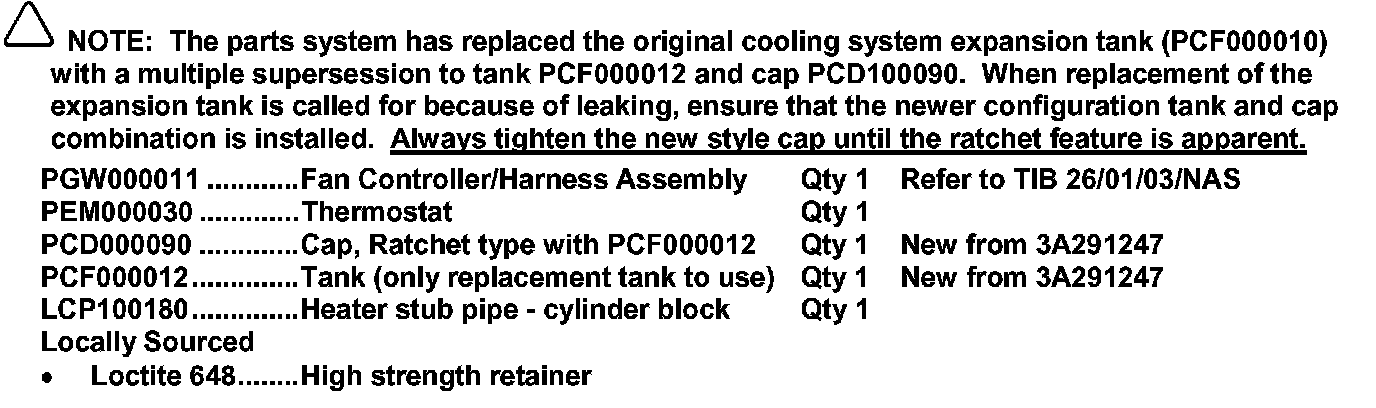 ^ If the early style tank and cap are installed, refer to GTR section 26.15.01 and replace the expansion tank assembly with the new specification tank and cap (PCF000012 and PCD00090).