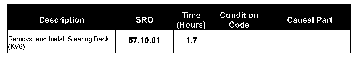 Remove and install the power steering rack following the new workshop method present in the Repair Procedure section of this bulletin below. Following this procedure permit reduction from the old labor time for "Steering Rack Removal and Refit" 57.10.01 from 2.4 hours to 1.7 hours