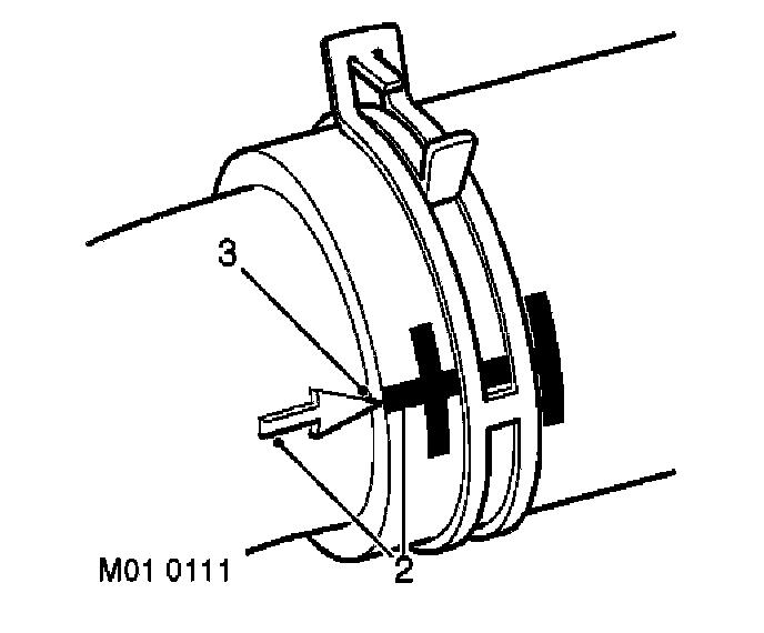 Correct orientation of cooling hoses is important in ensuring that the hose does not become fatigued or damaged through contact with adjacent components. Where 'timing' marks (2) are provided on the hose and corresponding connection, these must be used to ensure correct orientation. Hoses must be pushed fully onto their connection points. Usually, a moulded form (3) on the stub pipe provides a positive indicator.