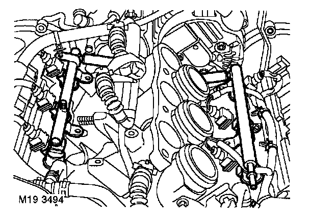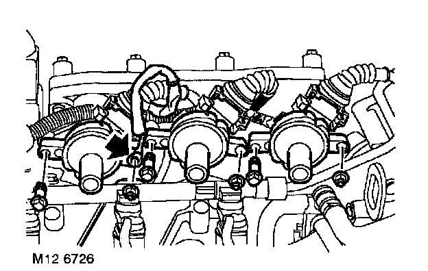 12. Remove 2 bolts securing fuel rail to LH inlet manifold.