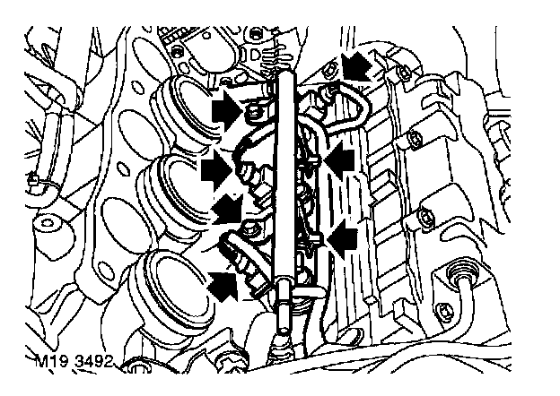 10. Remove 2 bolts securing RH fuel rail to RH inlet manifold.