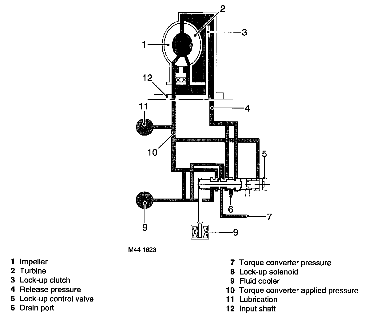 The torque converter acts as the coupling element between the engine and gearbox. The driven power from the engine is transmitted hydraulically and mechanically in certain gears and operating conditions, through the torque converter lock-up clutch to the gearbox. The torque converter is connected to the engine by a drive plate.