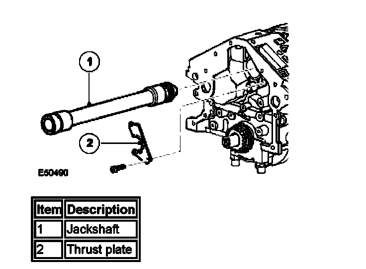 The jackshaft assembly is located centrally in the upper part of the cylinder block. The assembly is used to supply drive to each camshaft, via a chain. The LH camshaft is driven from the front of the jackshaft and the RH camshaft is driven from the rear. The Jackshaft assembly is driven, via a chain, by the crankshaft gear at the front of the engine. The assembly is held in position by a thrust plate.