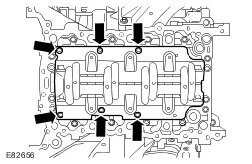 NOTE: Remove the camshaft bearing caps. Note their position, orientation and markings. Each is marked with it's position (number) and an orientation (arrow)