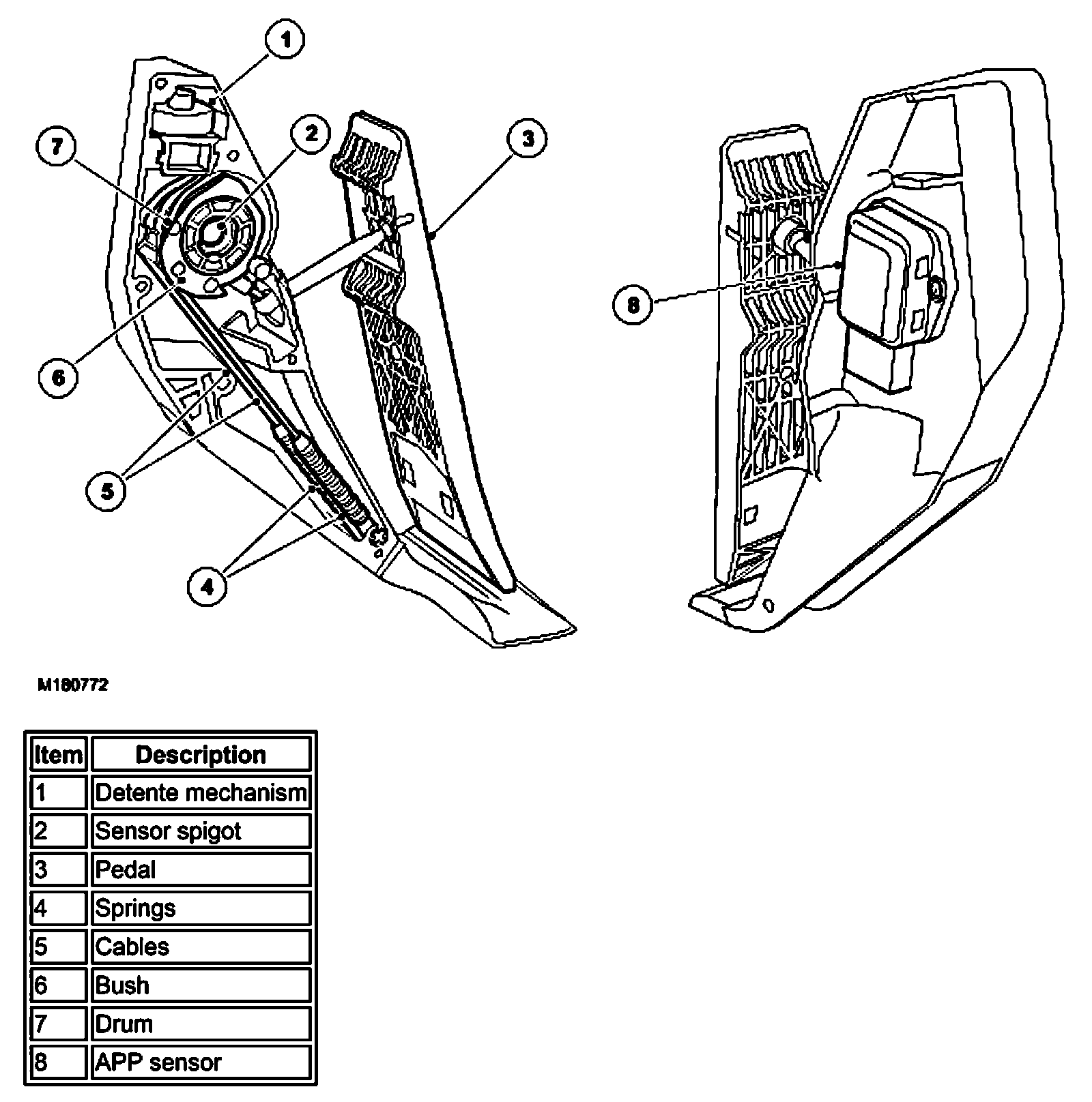 The APP sensor is located in plastic housing which is integral with the throttle pedal. The housing is injection moulded and provides location for the APP sensor. The sensor is mounted externally on the housing and is secured with two Torx screws. The external body of the sensor has a six pin connector which accepts a connector on the vehicle wiring harness.