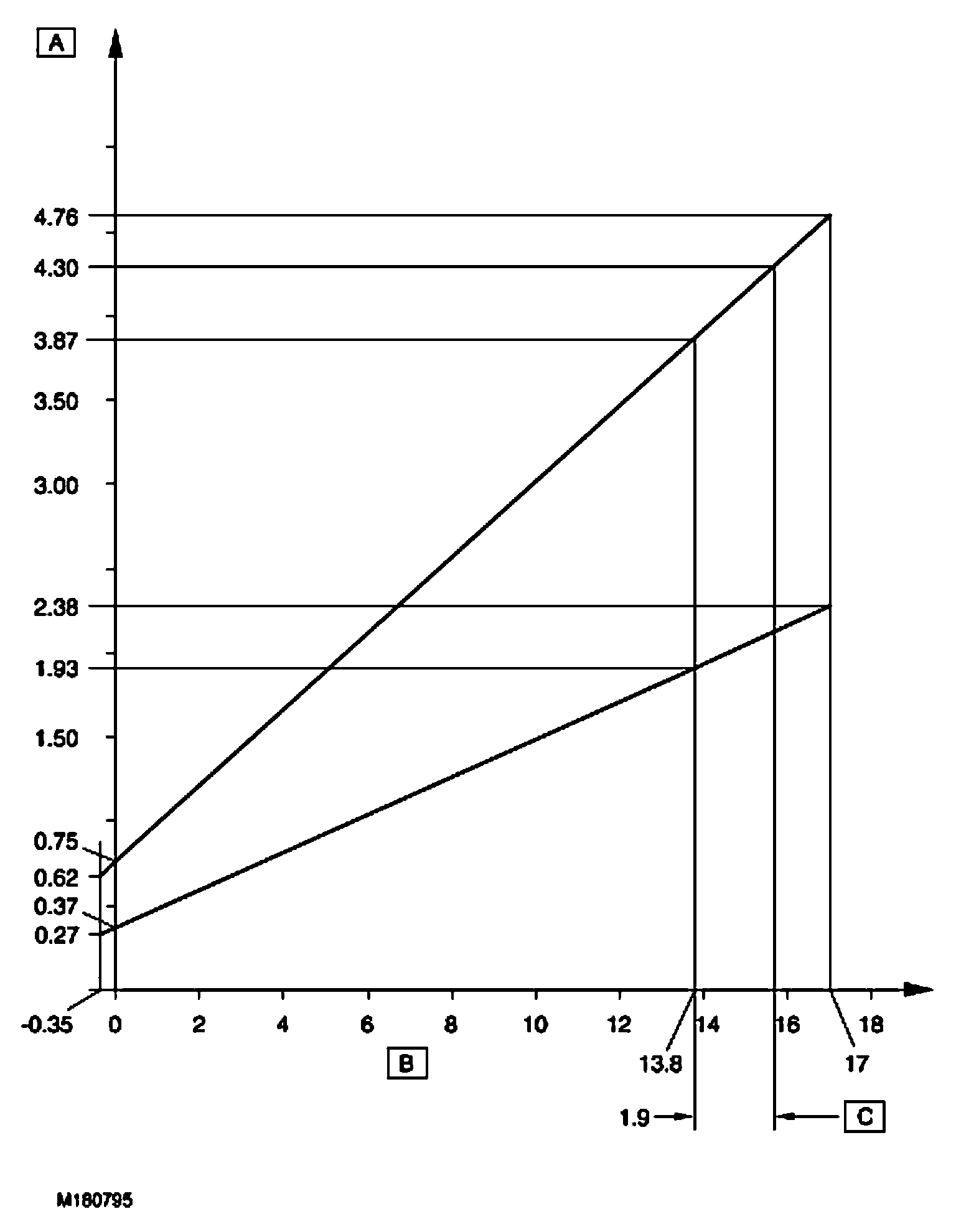 The APP sensor has two potentiometer tracks which each receive a 5 V input voltage from the ECM (engine control module). Track 1 provides an output of 0.5 V with the pedal at rest and 2.0 V at 100% full throttle. Track 2 provides an output of 0.5 V with the pedal at rest and 4.5 V at 100% full throttle. The signals from the two tracks are used by the ECM (engine control module) to determine fuelling for engine operation and also by the ECM (engine control module) and the TCM (transmission control module) to initiate a kickdown request for the automatic transmission.