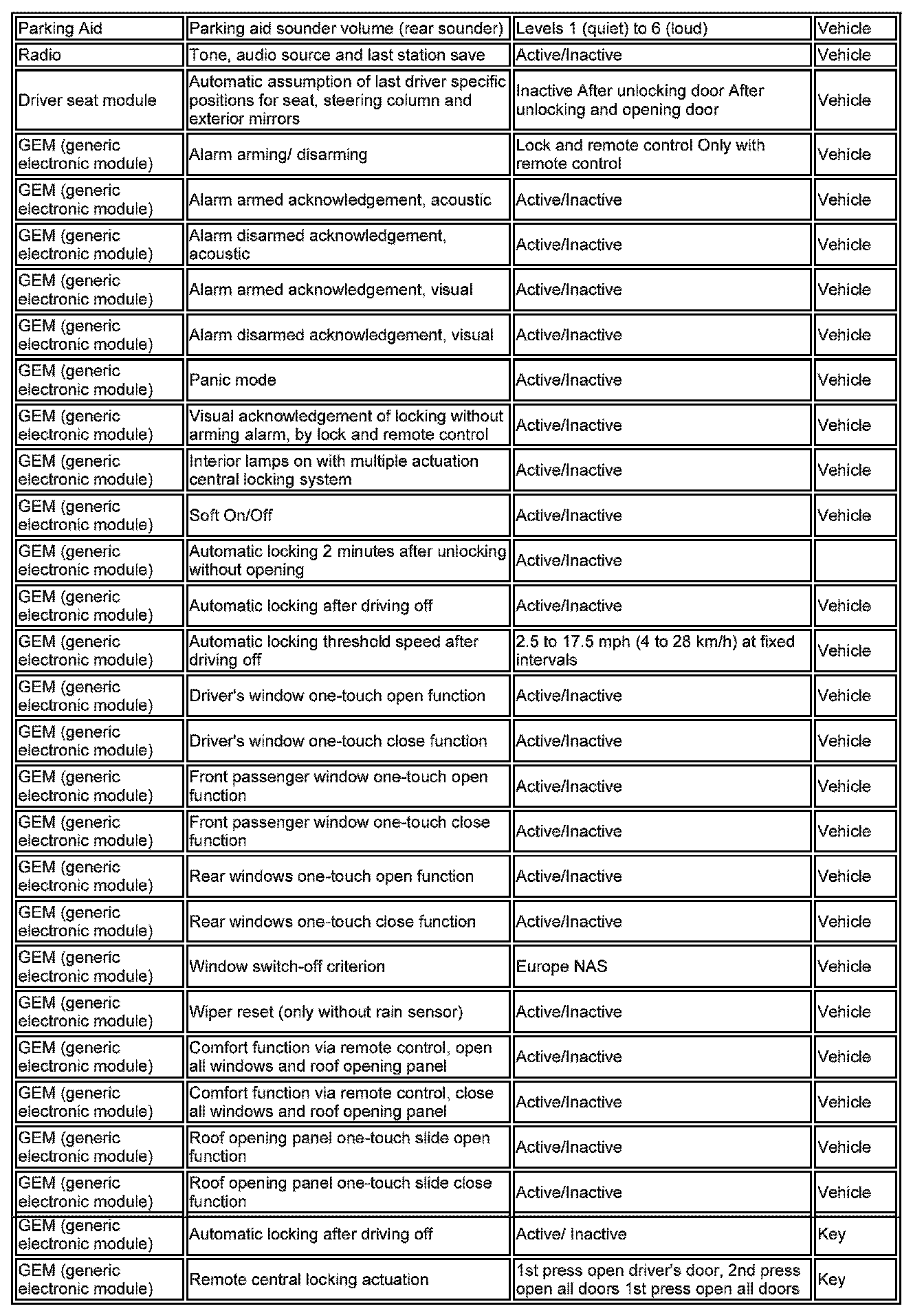 The following table contains the car and key memory functions that can be changed (depending on market) using T4.