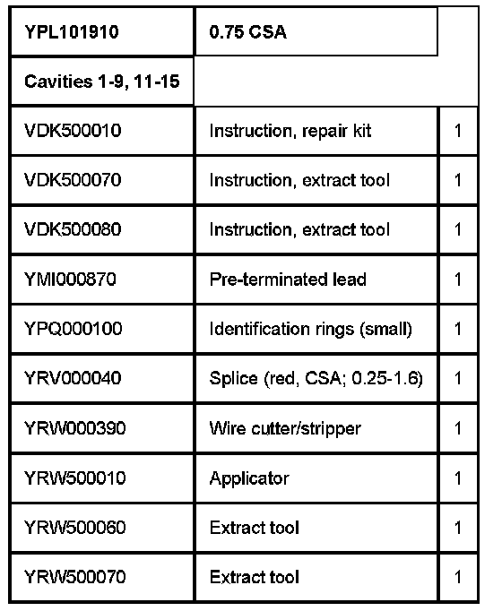 NOTE: Before commencing a repair, refer to the appropriate 'Service Repair Kit' table (see example in Table 1 below) for details of the correct tools and replacement components. The 'Service Repair Kit' table (where appropriate) can be found beneath the 'Connector Details' in the Electrical Reference Library (ERL).