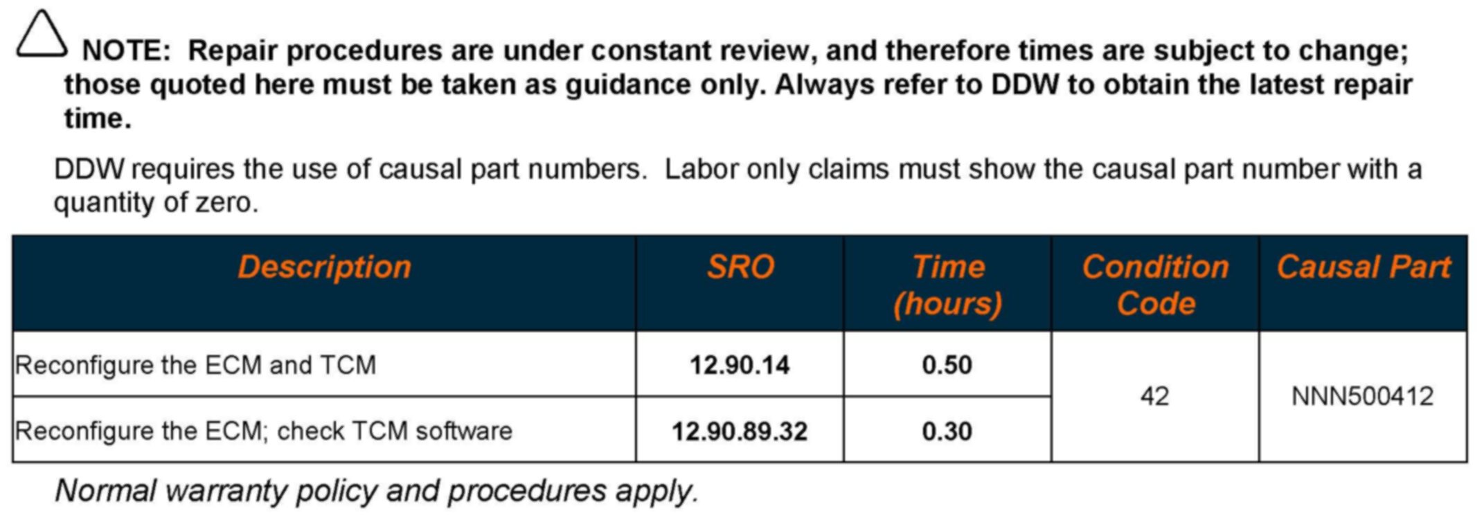 In the event of a customer concern of the above, refer to the Repair Procedure below to reconfigure the ECM, check the Transmission control module (TCM) software, and if necessary reconfigure the TCM.
