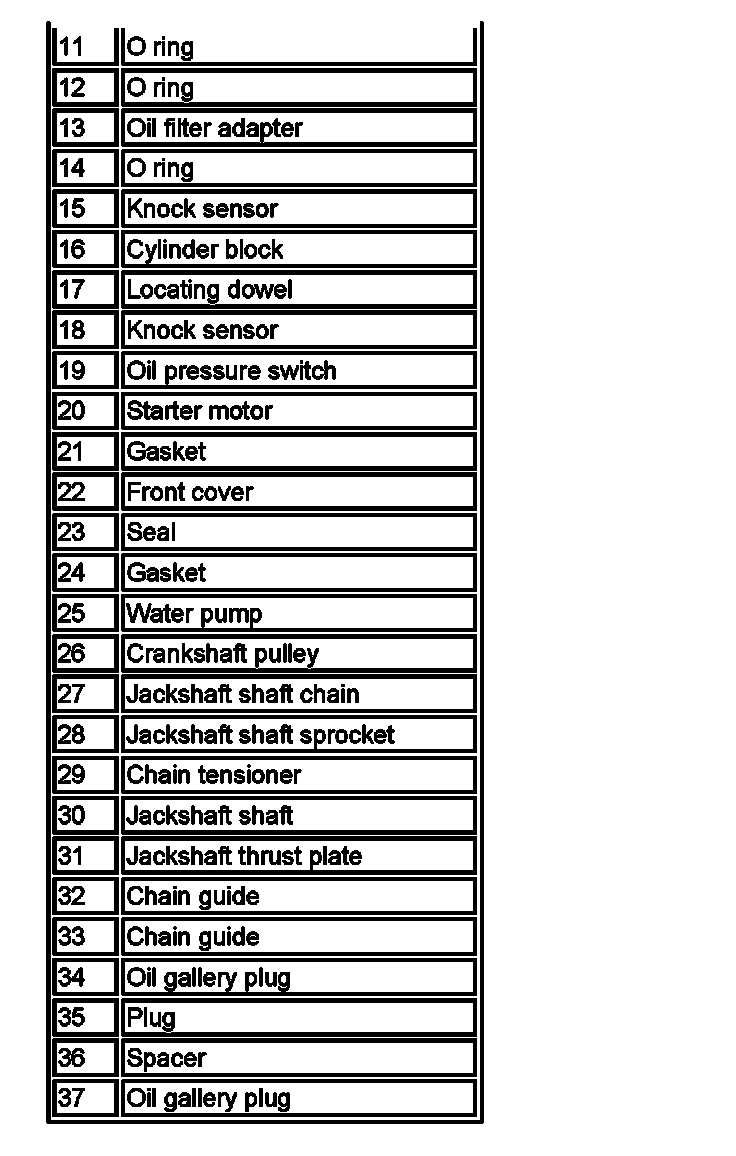 The jackshaft assembly is located centrally in the upper part of the cylinder block. The assembly is used to supply drive to each camshaft, via a chain. The LH camshaft is driven from the front of the jackshaft and the RH camshaft is driven from the rear. The Jackshaft assembly is driven, via a chain, by the crankshaft gear at the front of the engine. The assembly is held in position by a thrust plate.