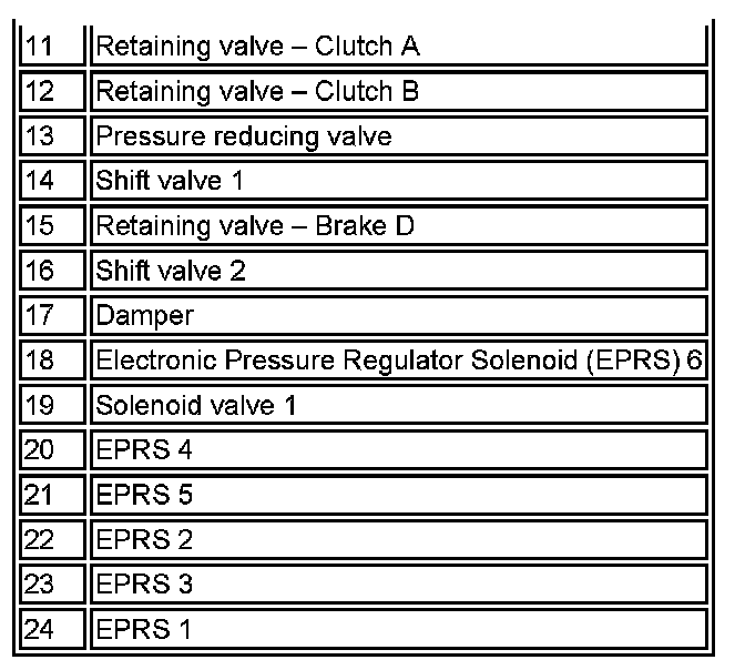 Six Electronic Pressure Regulator Solenoids (EPRS) are located in the valve block. The solenoids are controlled by Pulse width Modulation (PWM) signals from the TCM. The solenoids convert the electrical signals into hydraulic control pressure proportional to the signal to actuate the spool valves for precise transmission operation.